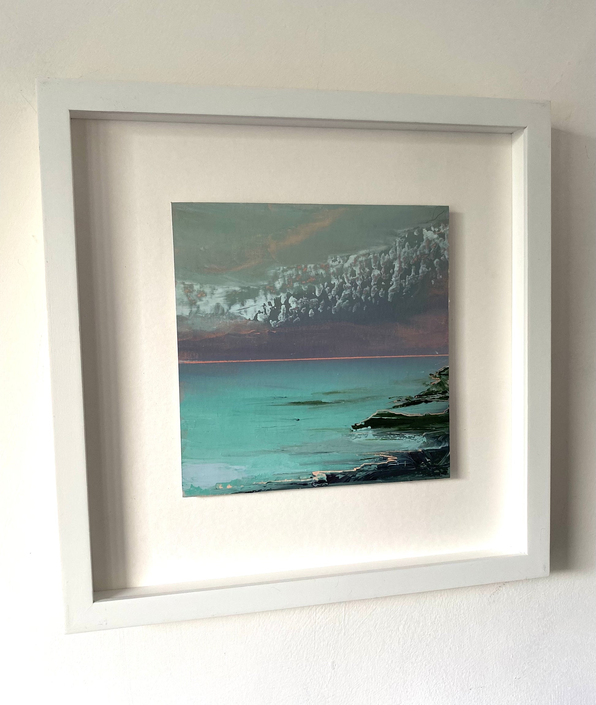 Comes in a glazed white wooden boxed frame